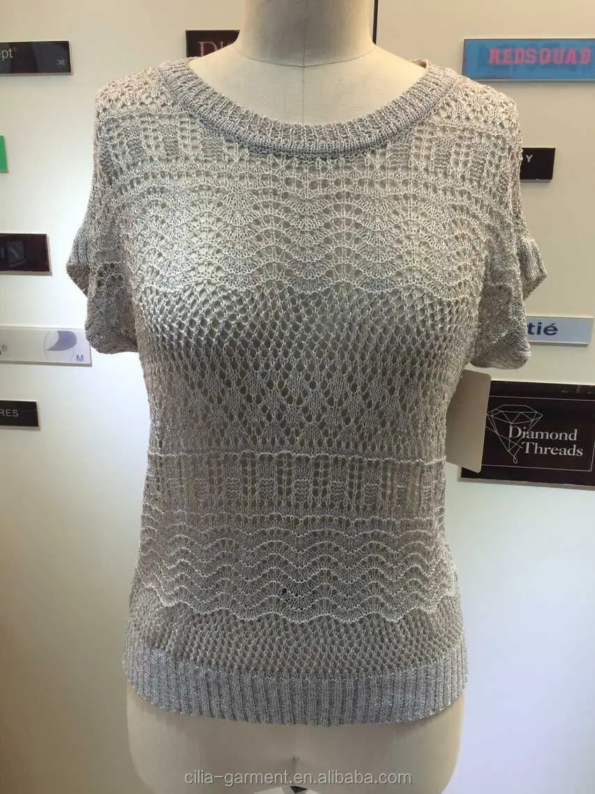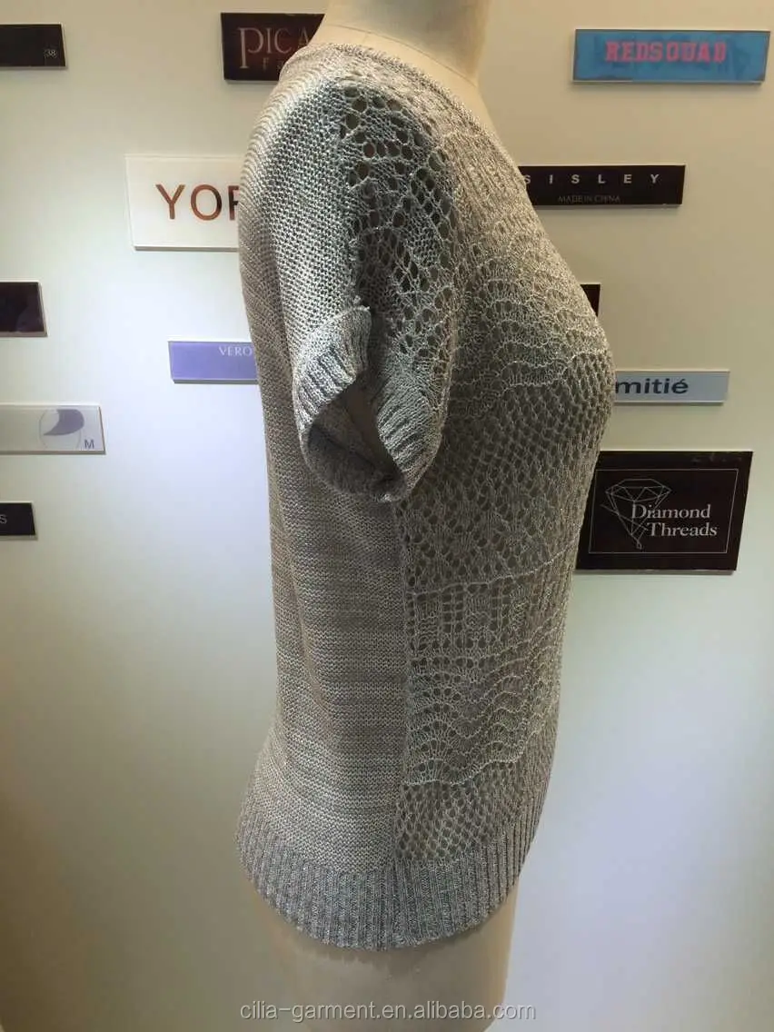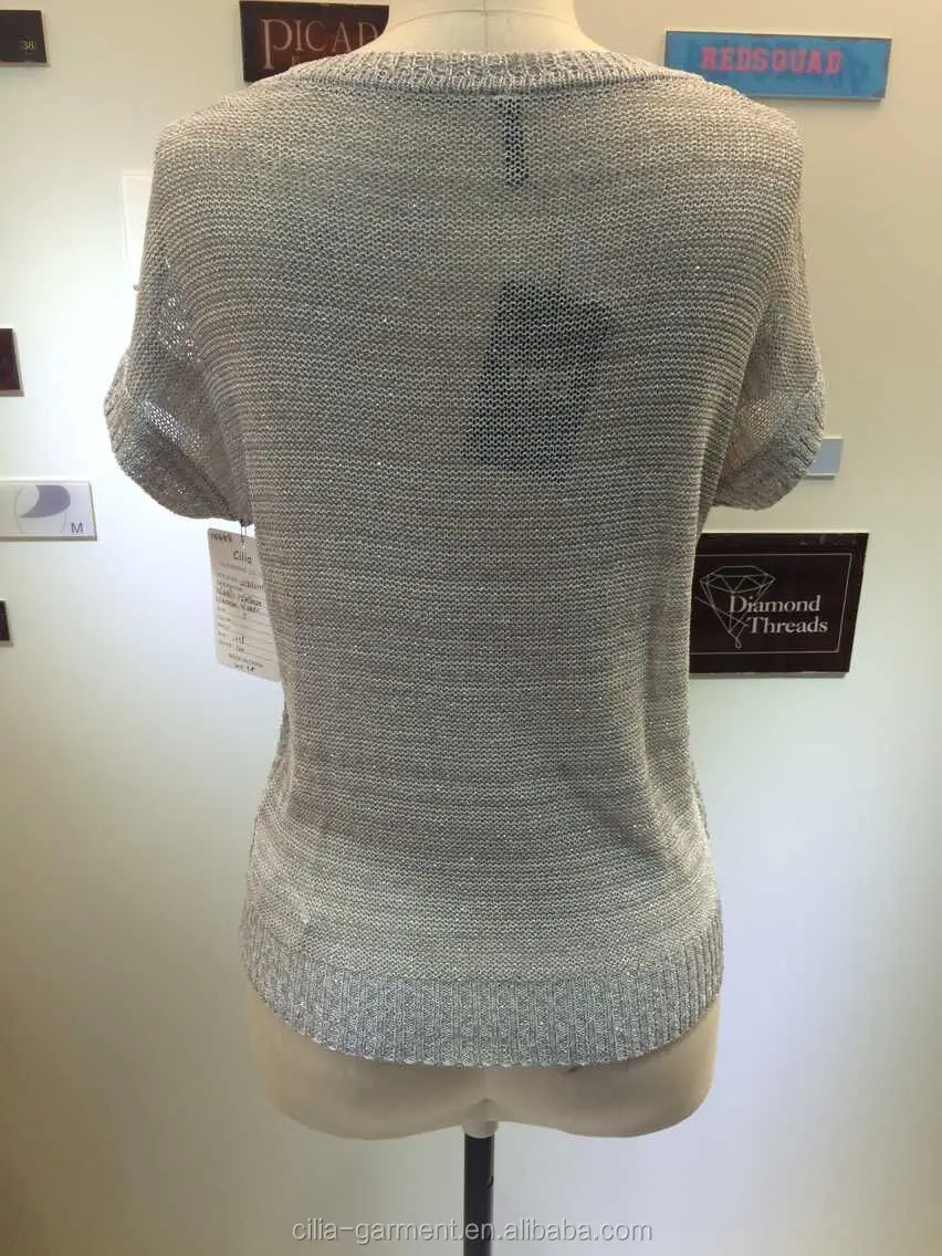 LADY SWEATER,SHORT SLEEVE,ROUND NECK LONG PULLOVER,WITH FASHION STITCH.THREE COLOR STRIPE.