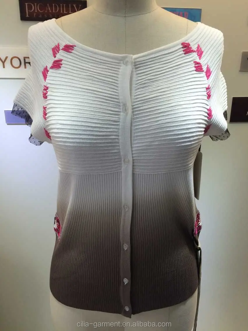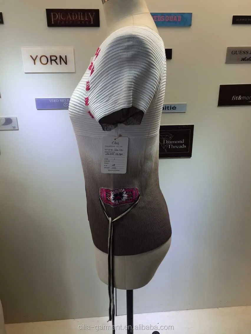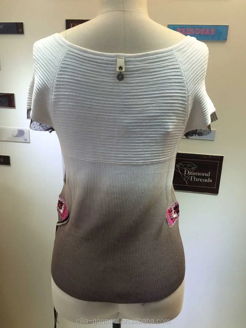 LADY SWEATER,SHORT SLEEVE,ROUND NECK LONG PULLOVER,WITH FASHION STITCH.THREE COLOR STRIPE.