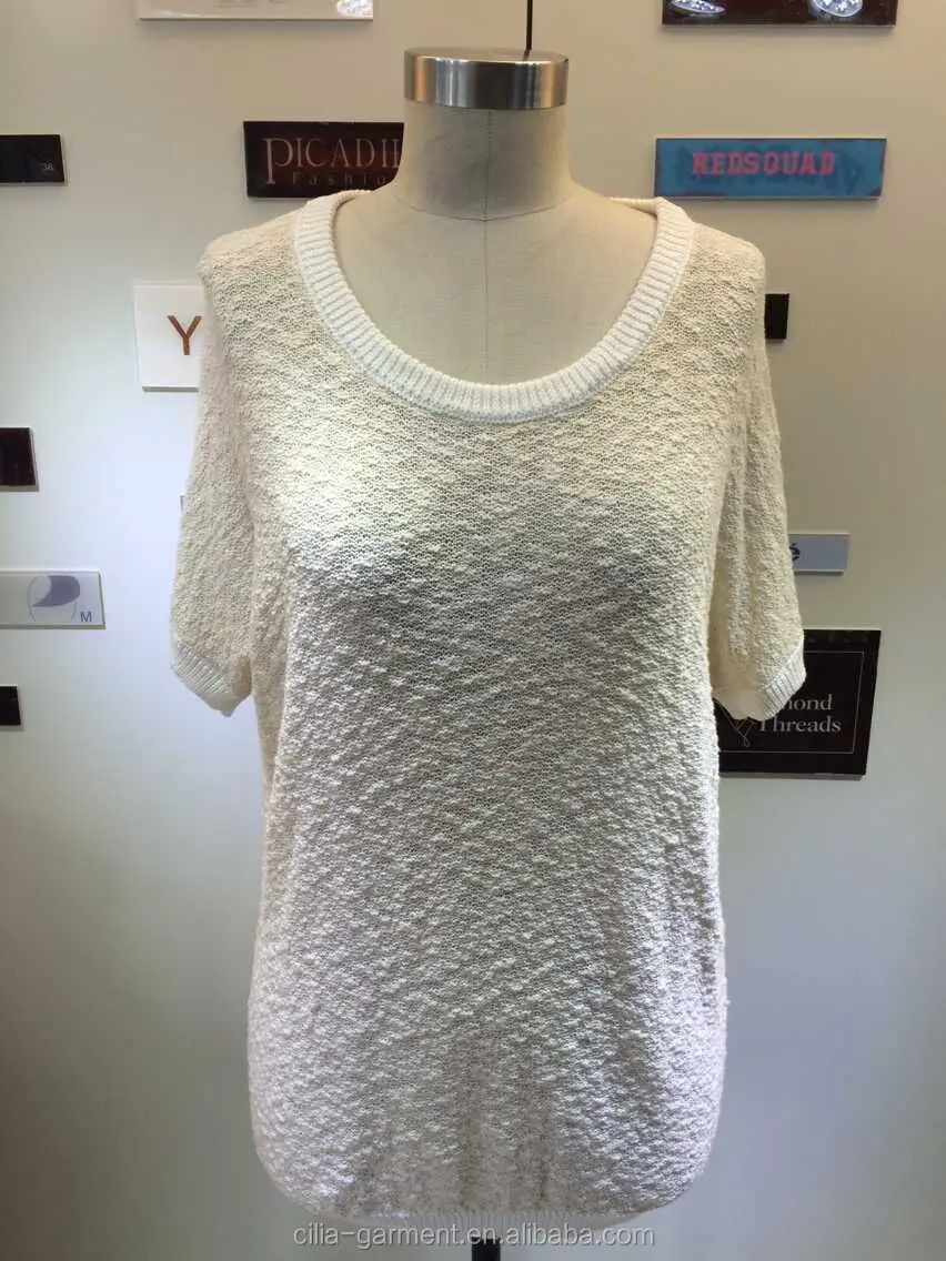 LADY SWEATER,SHORT SLEEVE,ROUND NECK LONG PULLOVER,WITH FASHION STITCH.THREE COLOR STRIPE.